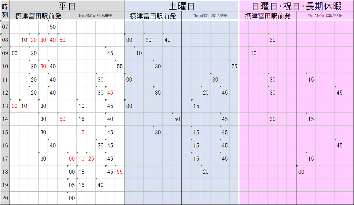 【時刻表 】 摂津富田駅前 ⇔ The AINO's SQUARE