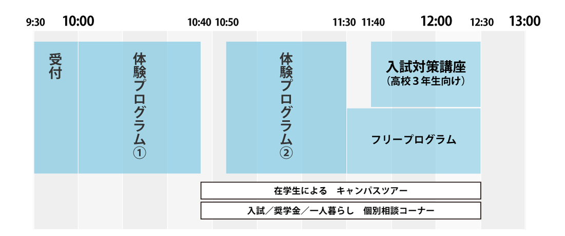 ご希望の学科に分かれて、職業の紹介、体験コーナー、在学生との交流などを実施します。体験の内容は毎回異なるのでリピーターの方も楽しめます!